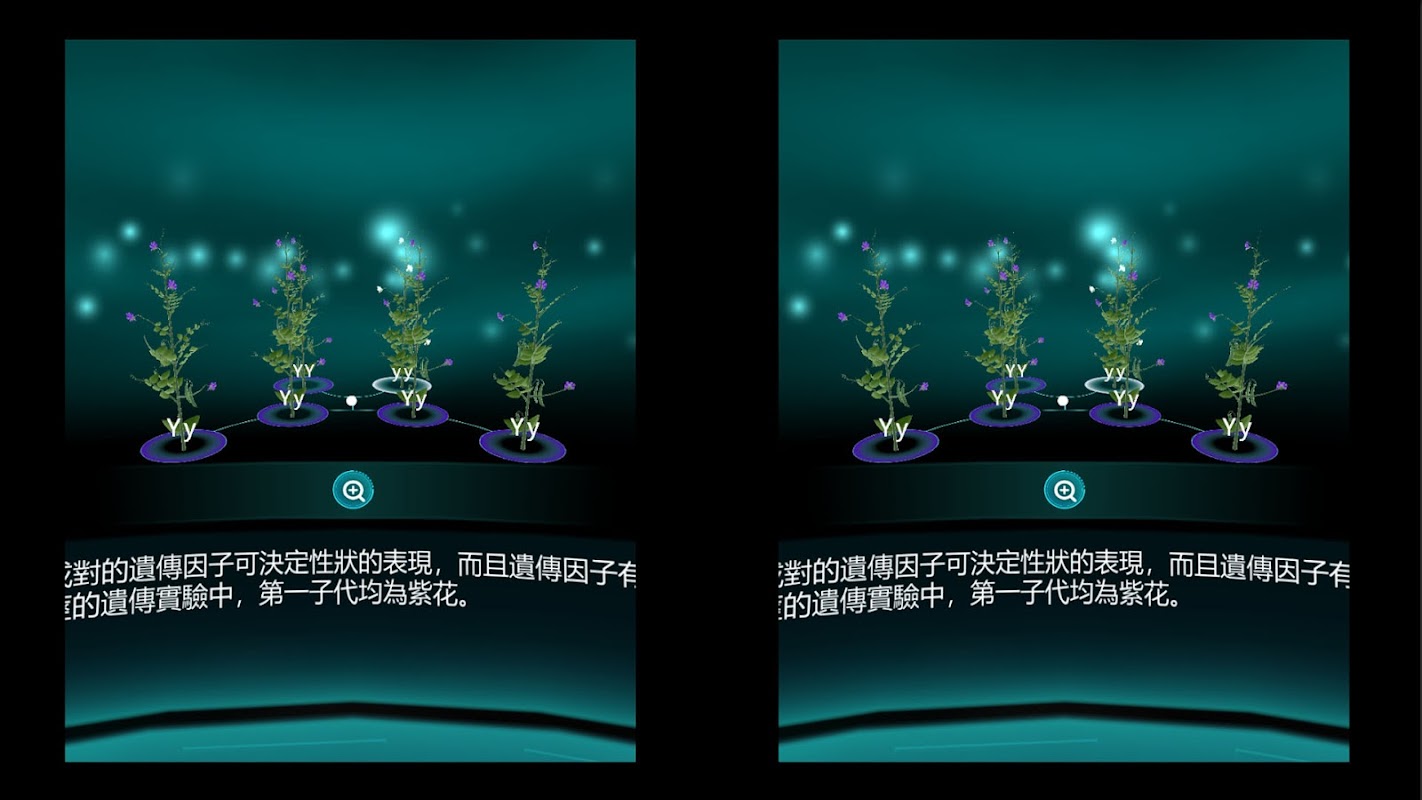 使學生能透過虛擬實境(VR)教材,體驗孟德爾的豌豆實驗過程等知識,從中發現孟德爾在遺傳學上所發現的兩大定律,並學習利用棋盤方格計算後代性狀的比例。