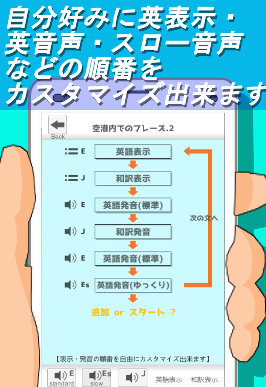 またこのアプリの特徴として、『英/和訳表示・英音声・英スロー音声・和訳音声』の順番を自分好みにカスタマイズして自動聞き流しが出来ます。