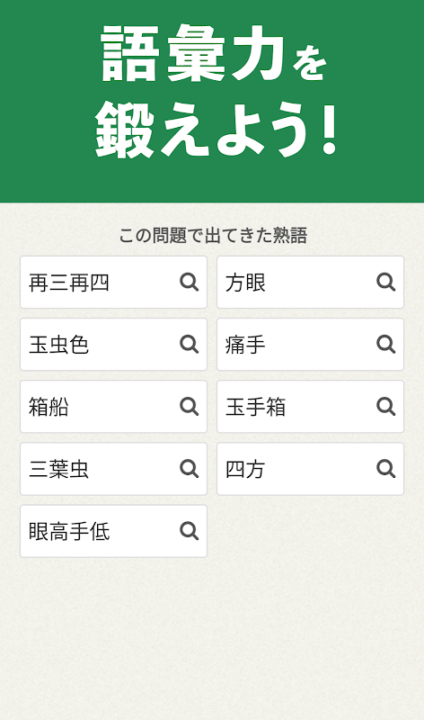 گیم کو صاف کرنے کے بعد، محاوروں کی ایک فہرست ظاہر کی جائے گی، تاکہ آپ کانجی کے معنی نہ جانے کے باوجود بھی سیکھ سکیں!