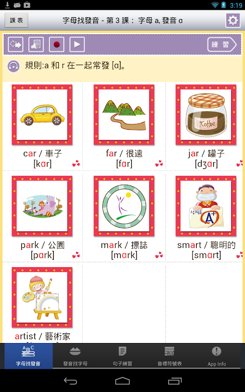 由發音找出對應的字母 (組合) 和常用單字,並說明各種特殊發音規則。