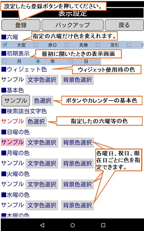 設定画面で選択した六曜(大安、赤口、先勝、友引、先負、仏滅)を好きな色で表示します。