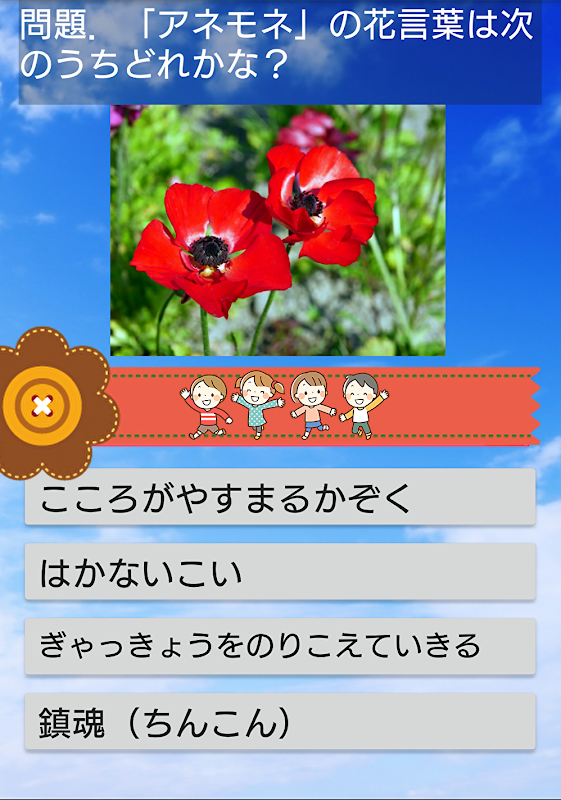 花言葉クイズアプリ。いろんな花の花言葉をクイズにして出題。答えには花の説明も書いてあるので図鑑や辞典としても使えるよ。暇つぶしに最適