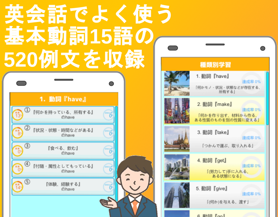 英会話でよく使う重要基本動詞15個の520英文例と海外旅行でよく使う英単語600語以上を収録!全ての英会話フレーズと英単語を【自然な英発音】で確認し、【英訳・リスニング学習問題】で練習して、英文は【わかりやすい解説機能】で文法や語句の理解を深めて使える力を付けられます!
