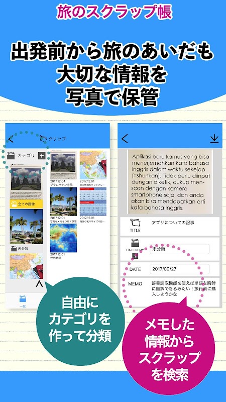 撮影した写真から保存したい部分をクリッピングして、日付、カテゴリ分けやタイトル付け、メモ記載が可能です。写真はカテゴリ別管理もOK。