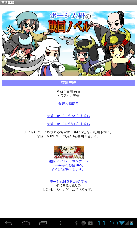 吉川英治の名作「茶漬三略」のノベルアプリ。