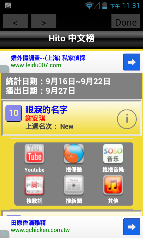 ※ 點擊歌曲/歌手名稱,或後面的「i」,開啟搜尋選單,可選擇搜尋影音平台之MV影片、MP3音樂、歌詞、歌手新聞、及其他相關資訊(搜尋結果,請點擊標題大字)。