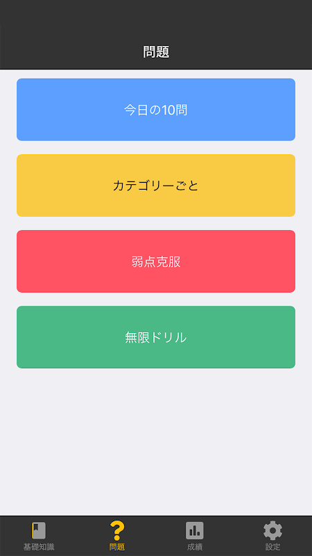 - آپ ''آج کے 10 سوالات''، ''کیٹگری کے لحاظ سے''، ''کمزوریوں پر قابو پانے''، اور ''لامحدود مشقوں'' سے سوال کا نمونہ منتخب کر سکتے ہیں۔