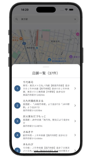 Displays a list of nearby restaurants. Quickly find a place that suits your mood.