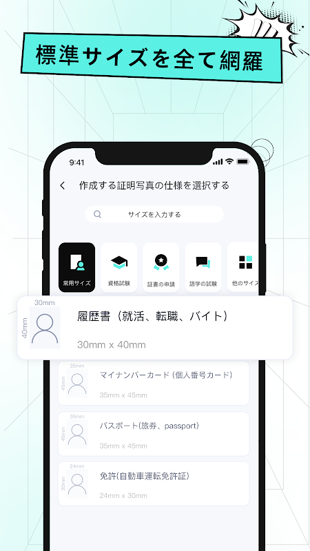اے آئی آئی ڈی فوٹو ایپ 30 سیکنڈ میں آئی ڈی فوٹو بنائیں! سیکڑوں ID فوٹو سائز دستیاب ہیں، بشمول ریزیوم، مائی نمبر کارڈز، ڈرائیونگ لائسنس، پاسپورٹ، مائی نمبر کارڈز، اور اہلیت کے امتحانات۔