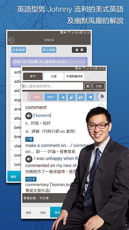 本 app 課程內容搜集四級擬真考題高頻單字片語及用法。課程內容秉持賴老師一貫嚴謹態度,單字解說詳盡,內容豐富,包含片語、衍生字、同/反義字、容易混淆字、和搭配用法等說明,單字與例句也均有道地美式發音。本課程的另一大特色是由新生代英語型男 Johnny 以流利的美式英語為同學們講解單字用法,通過幽默風趣的教學方式能讓學習效率加倍,絕不枯燥!