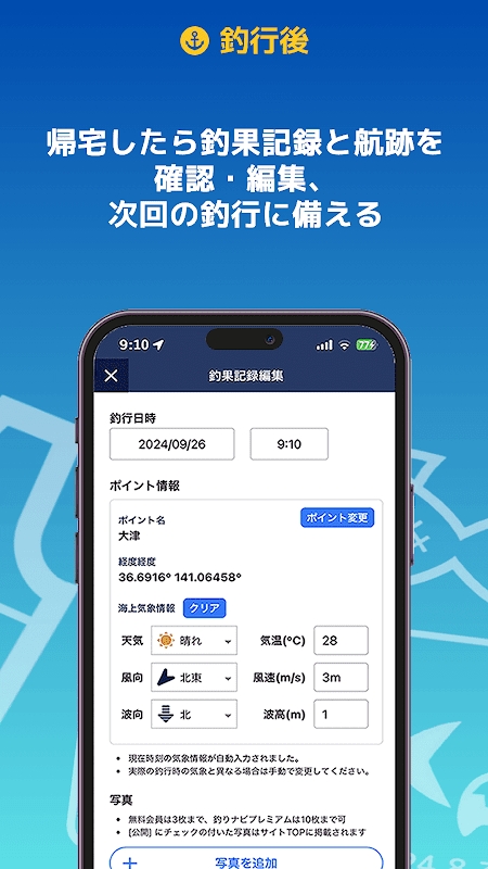 ماہی گیری کا ریکارڈ مچھلی کے پکڑے جانے کے وقت موسم کی معلومات اور لہروں کو بھی ریکارڈ کر سکتا ہے، جو مستقبل میں ماہی گیری کے سفر کی منصوبہ بندی کرتے وقت مفید ہے۔
