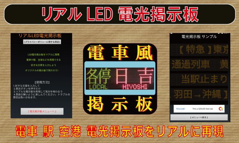 電車、鉄道駅、空港、警察パトカー等の電光掲示板をリアルに再現できる 表示したい文字を入力すれば、オリジナルの掲示板がすぐに完成 画面キャプして友達をビビらせろ