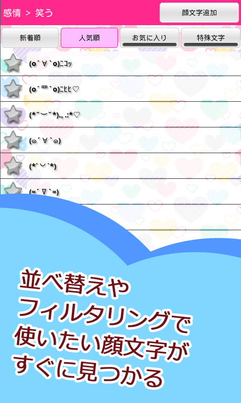 かわいい顔文字が簡単に入力できる!便利な機能がいろいろあるよ ・オリジナルの顔文字が登録可能 ・いらない顔文字は削除できる ・特殊文字フィルター機能
