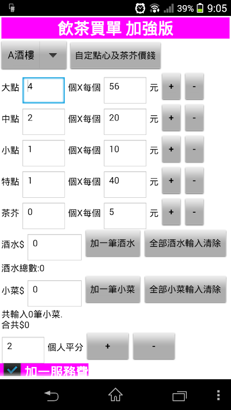 有沒有試過去茶樓飲茶時, 因為侍應出錯而導致被多收了錢的情況呢? 有了這個工具便可以更清楚及快捷地計算出總數. 更可同時計算出多人夾份時所須付款數目.