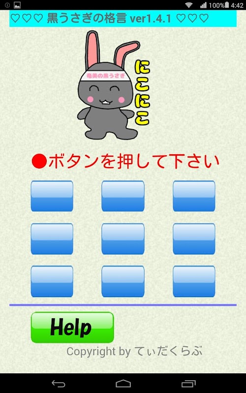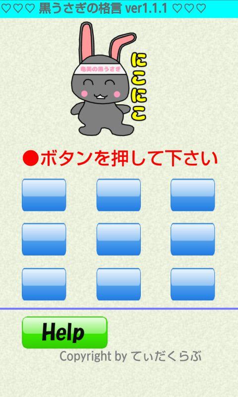 正面にある9個のボタンのひとつに黒うさぎの格言が潜んでいます。 言葉がある場合には OK が出てきて 黒うさぎの格言が表示されます。
