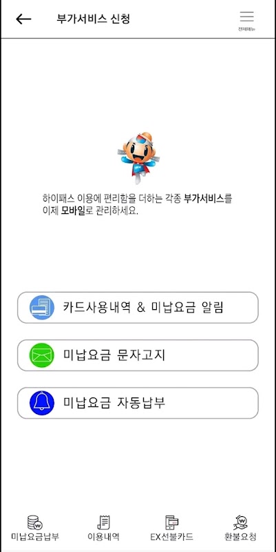 اگر آپ کو اینڈرائیڈ ورژن میں اپ گریڈ کرنے میں دشواری ہو تو براہ کرم ہائی وے ٹول ویب سائٹ (www.hipass.co.kr) استعمال کریں۔