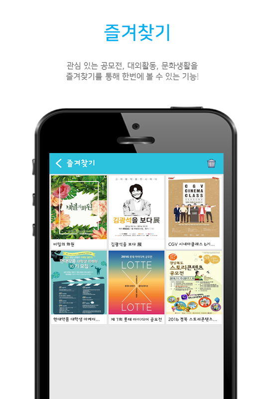 전국 사방팔방에서 진행되는 공모전과 대외활동 및 문화생활을 다시 보고 싶을 때마다 검색해서 찾는 건 시간낭비! 즐겨찾기로 한번 등록해두면 쉽고 빠르게 찾아볼 수 있어요~