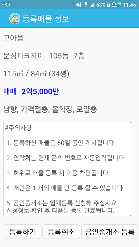 4. 등록된 매물은 2개월간 유지되며, 등록 만료 후 재등록 할 수 있습니다.