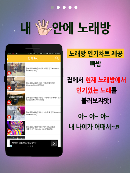 - 내 손안에 노래방에서 최신 노래들을 섭렵하면 유행에 뒤처지지 않는 최신곡 습득!