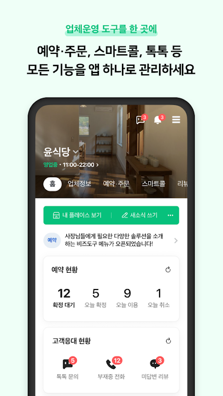 اسٹور کی معلومات میں ترمیم کرنے سے لے کر ریزرویشنز، آرڈرز اور جائزے کرنے تک، آپ آسانی سے Naver Smart Place ایپ پر ہر چیز کو چیک کر سکتے ہیں۔