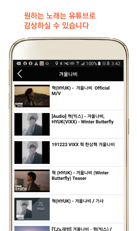 검색한 노래는 유*브, 벅스뮤직등 다른 음악 어플에서 직접 들을 수 있습니다