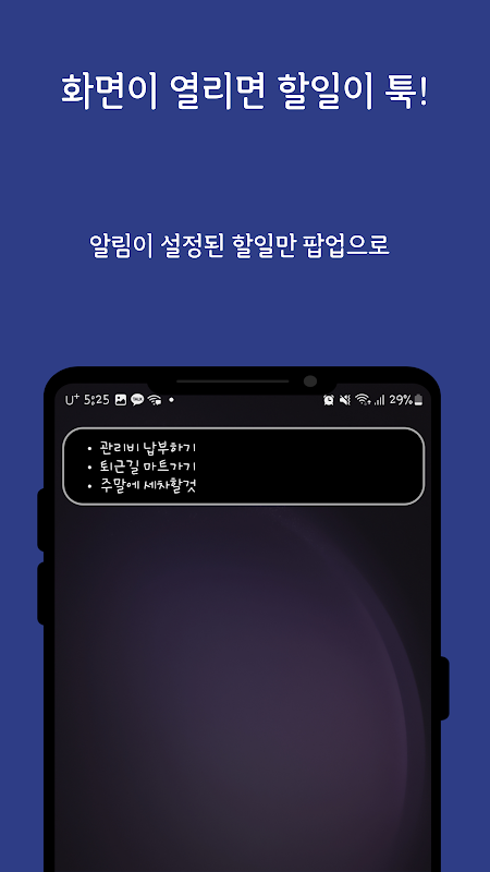 다양한 종류의 할일을 알림/예약알림 으로 필요한 때에 폰을 텄진 켤때마다 으로 보여줍니다.