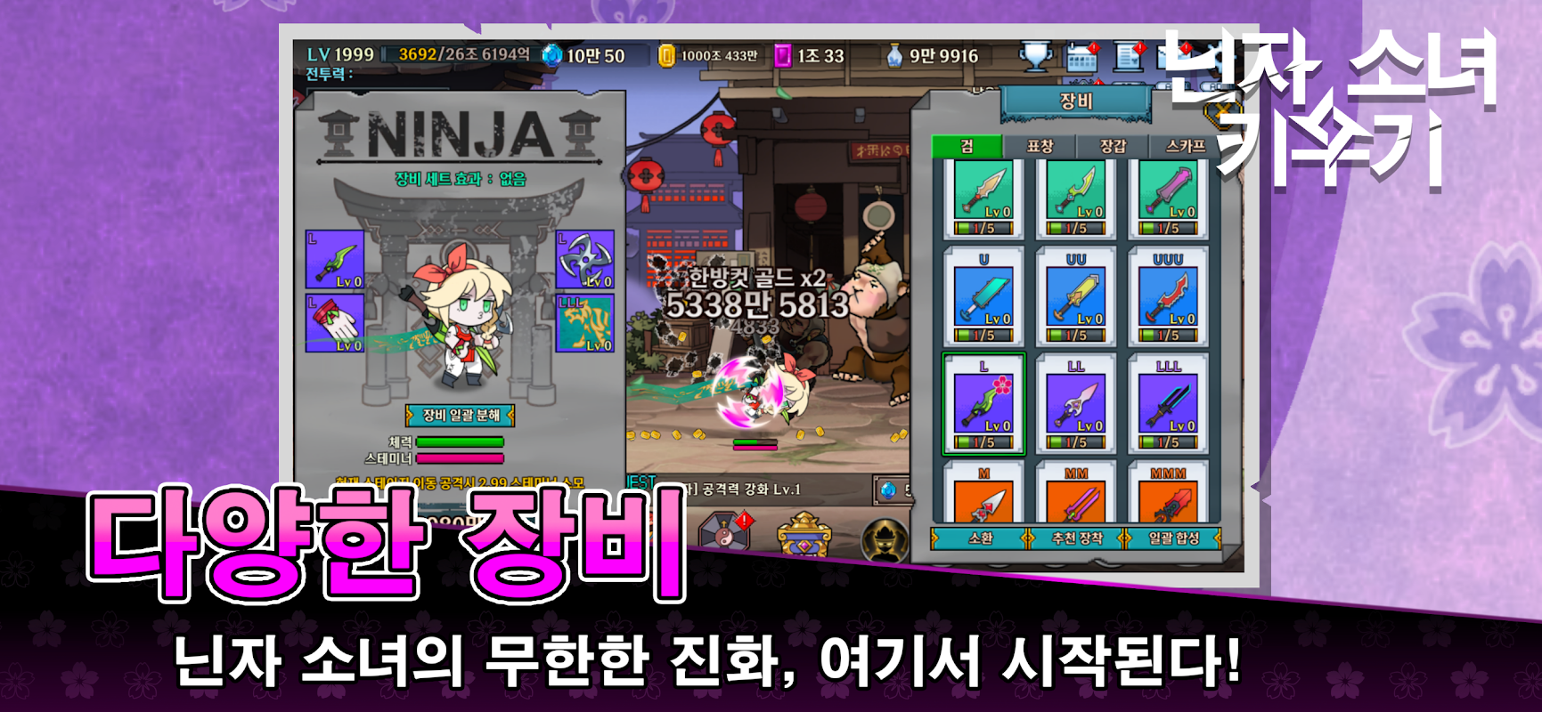 دشمنوں کو شکست دیں، طاقتور آلات حاصل کریں، مہارتیں سیکھیں، اور اپنی لڑکی کو حتمی ننجا میں ابھاریں!