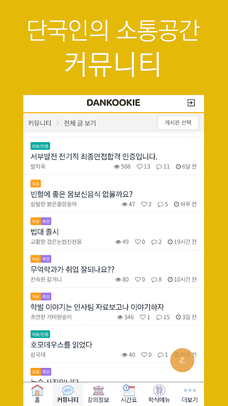 단대생 필수 어플리케이션!단국대학교 커뮤니티 단쿠키 입니다.단국대 커뮤니티 시간표 강의정보 학식정보 단쿠키에서 찾으세요!