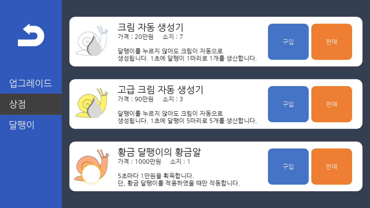 크림1개는 달팽이1마리를 소비하며 생성됩니다.