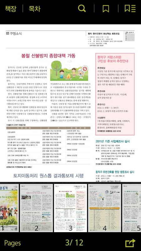 지면보기eBook기능 - 가로보기, 확대보기, 검색, 즐겨찾기, 목차, 미리보기, 지면그대로 트위터, 페이스북, 미투데이, 카카오톡, 이메일, 문자 공유기능