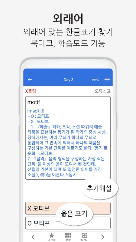 국어 기출문제에서 꼭 알아야 하고, 외워야 할 필수 핵심 개념들로만 제작되었습니다. 언제 어디서나 쉽고 편하게 앱으로 학습하시는 동안 국어 시험 목표 점수에 도달하실 수 있을 것입니다.