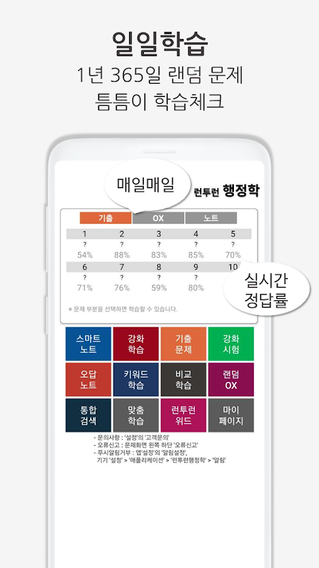 - 하루 랜덤으로 소량의 문제를 풀며 취약 부분을 확인하고 하단 버튼으로 보완할 수 있습니다.