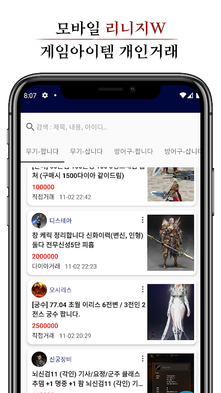 모바일 기반 실시간 채팅, 아이템 매물검색, 최신 소식 정보 등 리니지W 아이템 거래 및 다양한 기능을 체험해보세요.