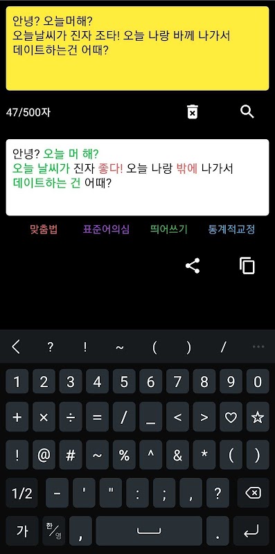 مؤثر کوریائی ہجے درست کرنے والی ایپ! وہ جملہ درج کریں جسے آپ چیک کرنا چاہتے ہیں اور ہجے فوراً درست کر دیا جائے گا۔