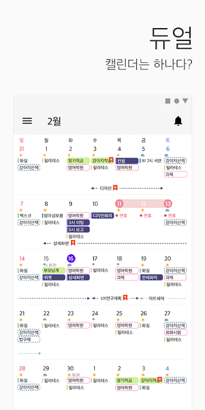 -میرے ذاتی شیڈول اور پلگ ان کا نظام الاوقات (عوامی / نجی) ڈوئل کیلنڈر پر جس طرح چاہیں جا سکتا ہے۔ آئیے اپنا شیڈول ترتیب دیں تاکہ دیکھنا آسان ہو۔ (ہم شیڈول اندراج کے لئے بہت سارے خوبصورت رنگوں کی حمایت کرتے ہیں ، اسے خوبصورت بناتے ہیں۔)