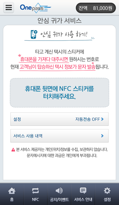 (대구시 법인 및 개인택시에 부착된 NFC 스티커에 스마트폰을 갖다 대면 탑승한 차량정보 등을 보호자에게 전송)