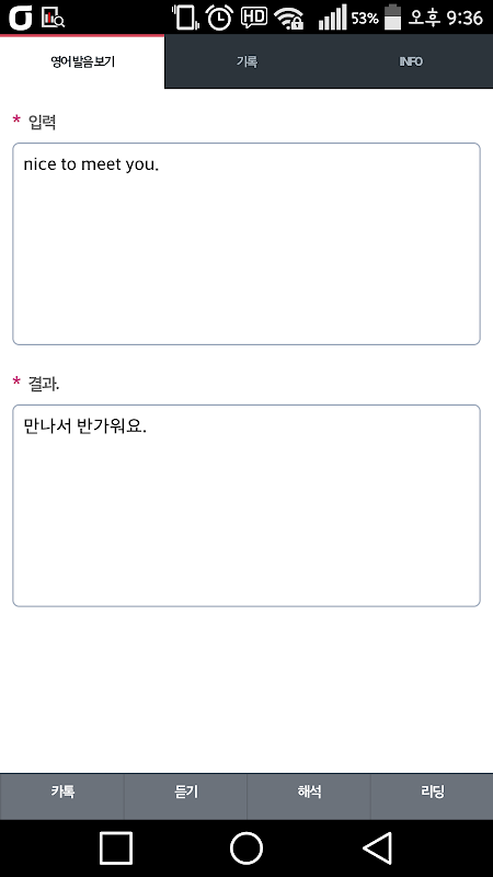 입력한 영어를 발음 그대로 한글로 출력해주는 앱. 번역/듣기/기록/카카오톡전송 의 다양한 기능을 제공합니다.
