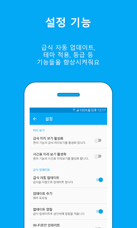 편의기능의 급식,시간표 미리보기 기능 ,급식 자동 업데이트 기능, 테마 기능, 앱 정보, 사용자 등급 설정 기능 등이 있습니다. 반드시 사용해보세요!!)