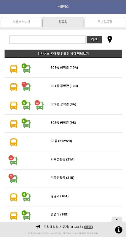 - 스마트폰 기종에 상관없이 "서울대학교 앱" 에서도 셔틀버스 위치알림 서비스를 이용하실 수 있습니다.