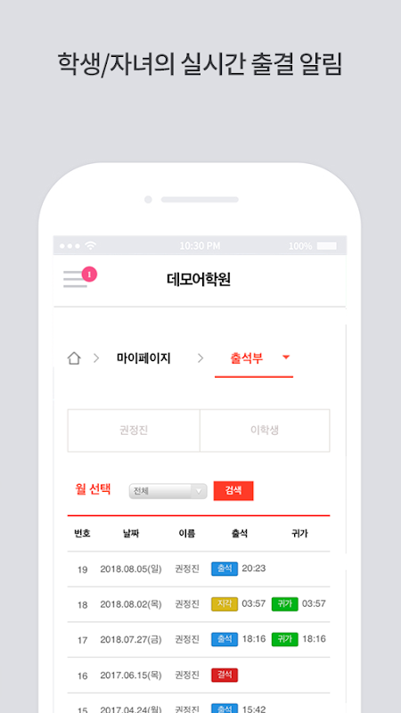 - 출석부에서 학생/자녀의 출결 사항을 실시간으로 받아 볼 수 있습니다.