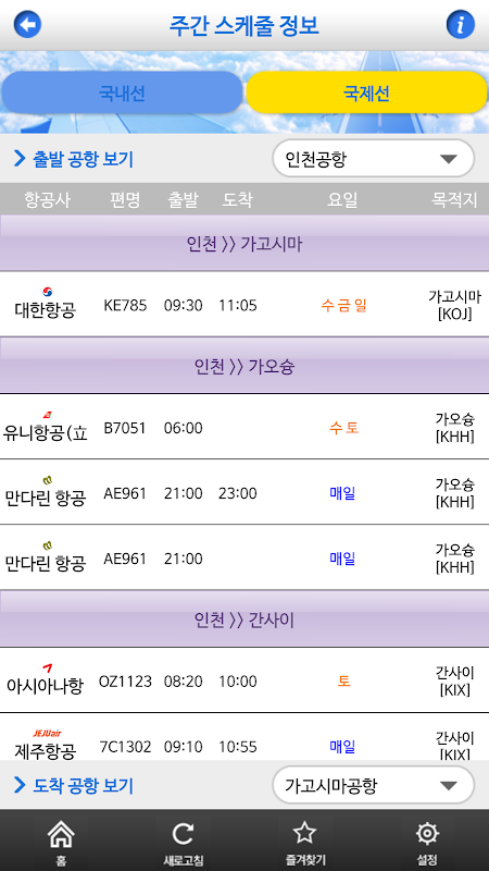 - 국제선/국내선 주간,일자별 스케줄 정보