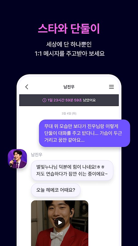 ٹروٹ کے شائقین کے لیے ایک 1:1 پیغام مواصلاتی پلیٹ فارم۔ آپ ستاروں کے ساتھ پیغامات کا تبادلہ کر سکتے ہیں اور ان لمحات کو برقرار رکھ سکتے ہیں۔