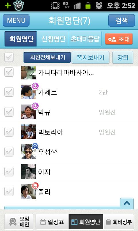 회원명단 리스트, 회원초대, 쪽지보내기, 쪽지보관함