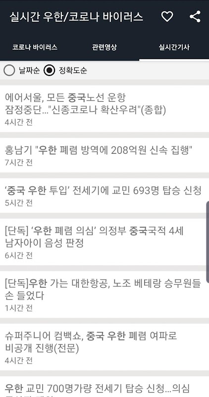 코로나 바이러스 , 중국 우한 발병한 바이러스에 관련된 기사와 유튜브의 내용을 실시간으로 제공하는