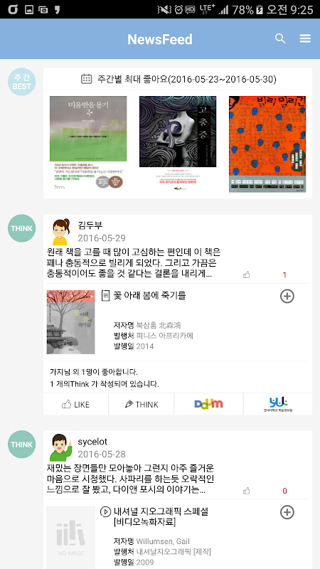 2. Like, Think : 마음에 드는 자료에 대해 Like버튼을 눌러 표현할 수 있으며, 서평이나 간단한 코멘트를 Think로 남길 수 있습니다. 좋은 Think에 대해서는 Think Like를 눌러표현해주세요.