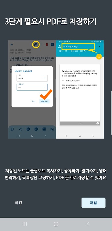- 저장된 노트는 클립보드 복사하기, 공유하기, 읽어주기, 영어 번역하기, 목록상단 고정하기, PDF 문서로 저장할 수 있어요.