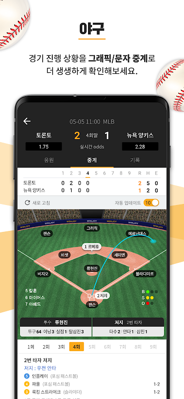 آج کے اسکور کو پیش کر رہا ہوں ، جو کھیلوں کے بہترین معیارات اور کوریا میں واحد گرافک براہ راست نشریات فراہم کرتا ہے۔