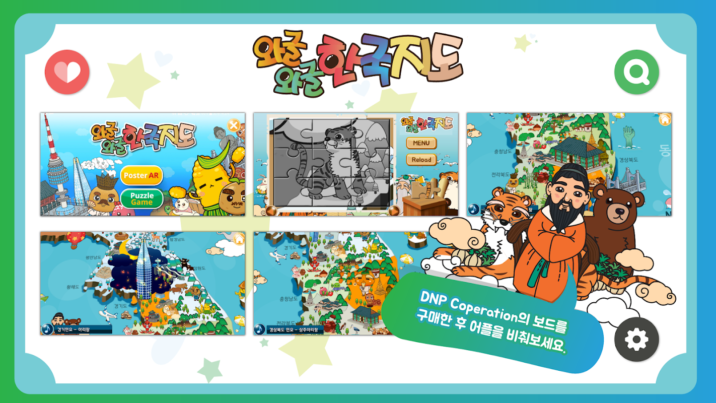 대한민국의 여러 설화, 명소, 특산물의 애니메이션과 재미있는 퍼즐게임을 즐길 수 있어요!