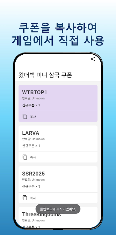 آپ "Watdeobuk Mini Samguk" کے کوپن چیک اور کاپی کر سکتے ہیں۔