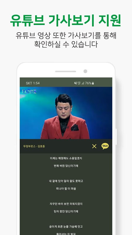 - 유튜브 영상에서도 원하시는 가수의 노래를 들으실 수 있으며 가사 또한 지원을 하고 있습니다. 영상 길이가 긴 경우 가사가 없을 수 있으니 참고 부탁드립니다.